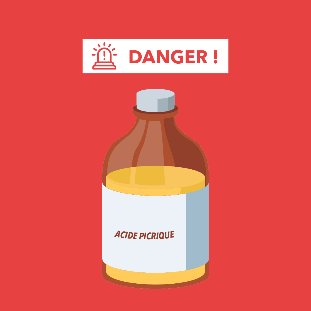 - Étiquette “acide picrique”, “picrate”, “TNP” ou illisible